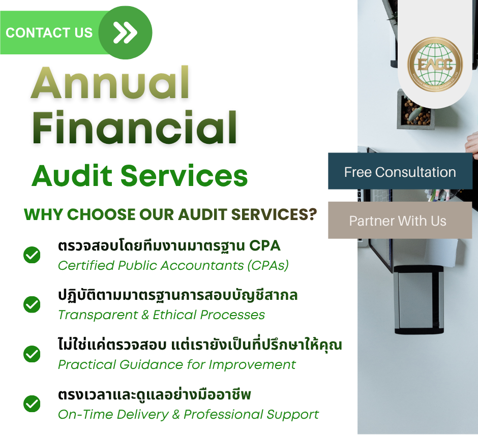 “บริการตรวจสอบบัญชีครบวงจร โดยผู้สอบบัญชีรับอนุญาต (CPA) ช่วยให้ธุรกิจของคุณนำเสนองบการเงินที่ถูกต้อง โปร่งใส และเชื่อถือได้ รองรับการยื่นงบและตรวจสอบจากทุกหน่วยงานรัฐ”